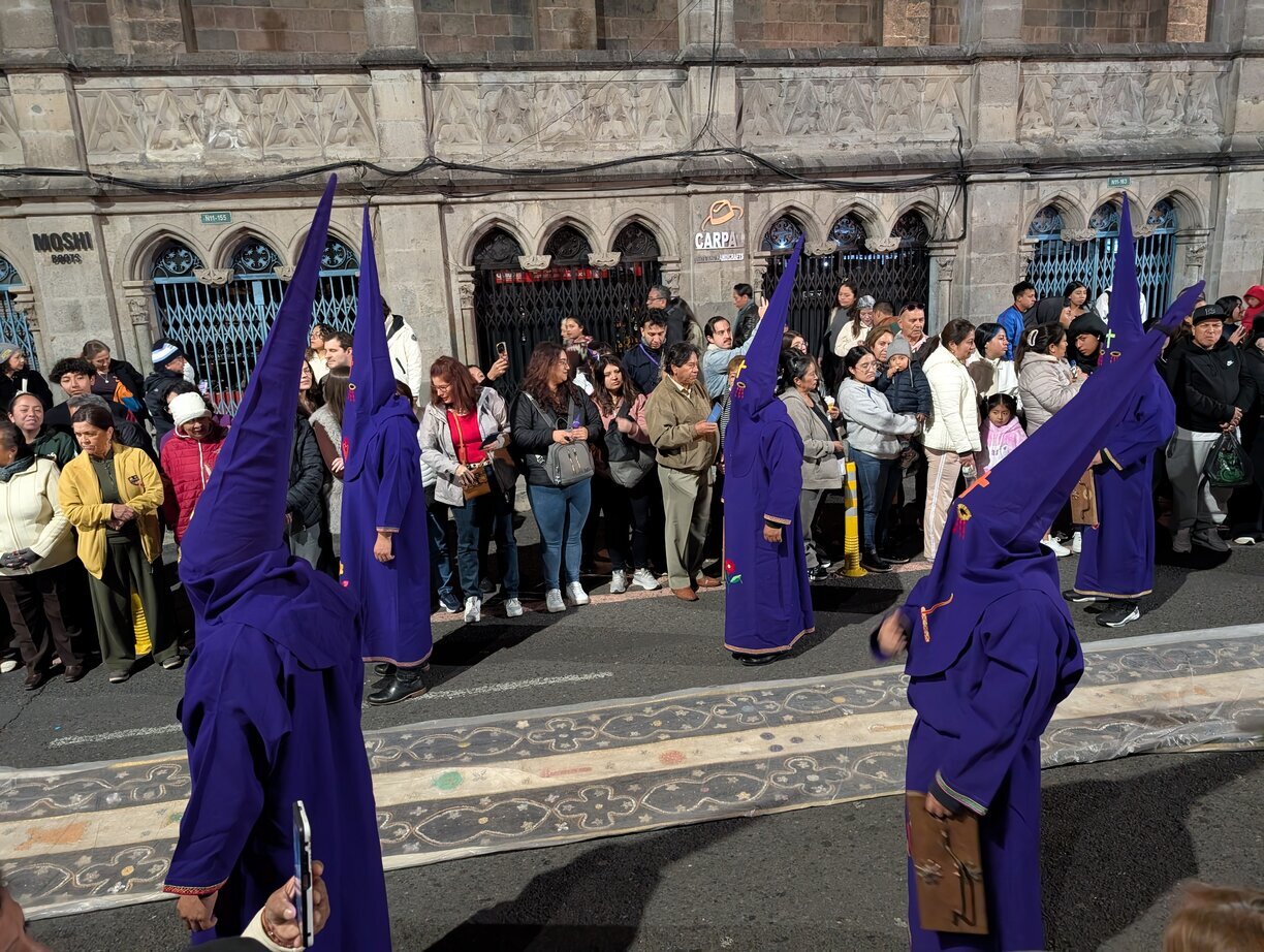 De volgende avond wordt een beeld van Jesus door de straten gedragen gevolgd door kleurrijke verklede types met lichtjes en een afvaardiging van indianenvolken in klederdracht. Het is de oefenprocessie voor de echte grote Paasprocessie van de dag er op waarin mensen kruizen dragen om boete te doen voor hun zonden of te vragen om een wonder. Wij vliegen die 3 april naar De Galapagos, dus moeten de zelf flagellatie missen.